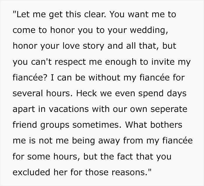 In the past, one friend of my fiancé got married, and I hadn’t met him, so I wasn’t invited. I wasn’t mad.His refusal to attend was seen as insulting since;