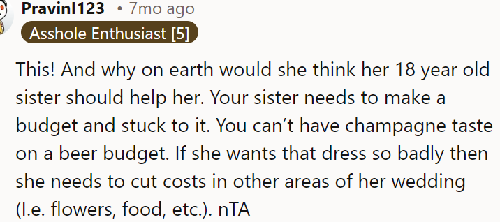 Her sister, still determined, placed the dress on hold and began asking other siblings for financial assistance. So, the OP was wondering if she was in the wrong for not helping her sister pay for her wedding dress.