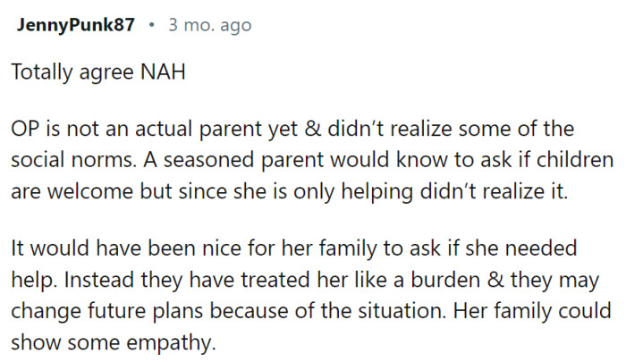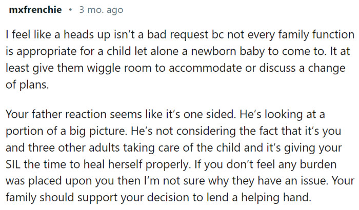 In conclusion, while the family could have shown more understanding, they also raised valid concerns. Both OP and her family need to tread carefully, respecting the delicate balance that must be maintained in this unique circumstance.