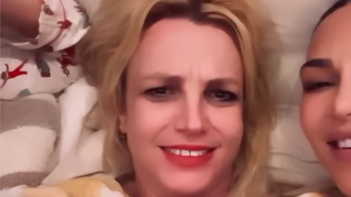 In the Instagram clip, Britney, Kim, and Khloé can be seen lounging on a bed, with Britney playfully remarking to the camera before giving her companions a kiss. Khloé humorously adds, "In our geriatric bed."