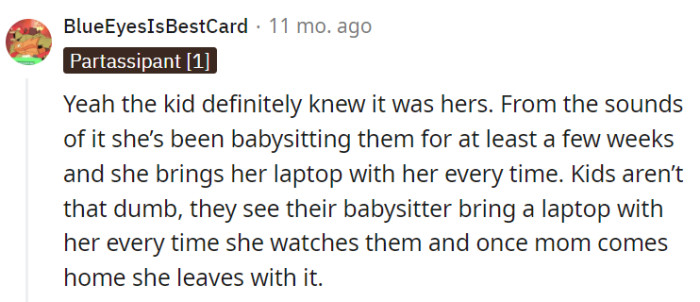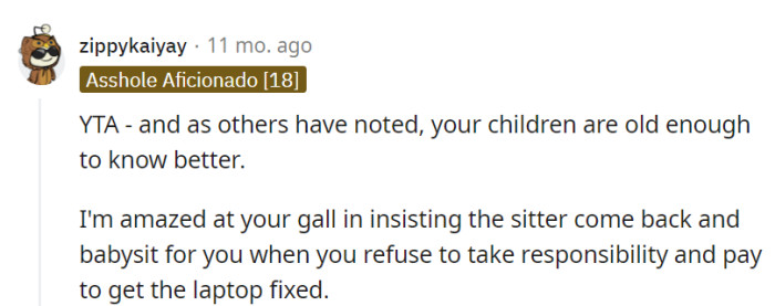 RedditThe babysitter's laptop was broken by the youngest child, leading to a disagreement over responsibility and reimbursement. Eventually, OP asked the babysitter to leave.