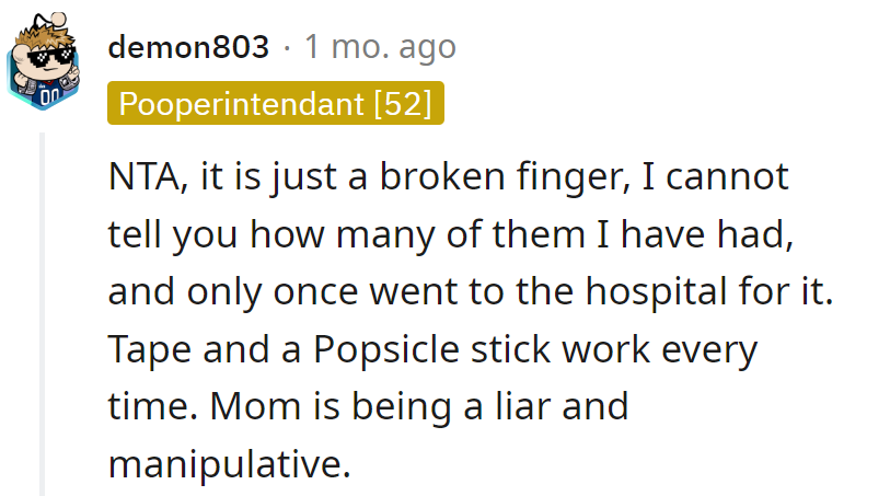 OP, a divorced parent, faces a contentious situation with his ex-wife over their 7-year-old son's minor injury—a broken finger from a bowling accident. The doctor's assurance of a quick recovery clashes with the mother's exaggerated concern, leading to a dispute over a planned trip.