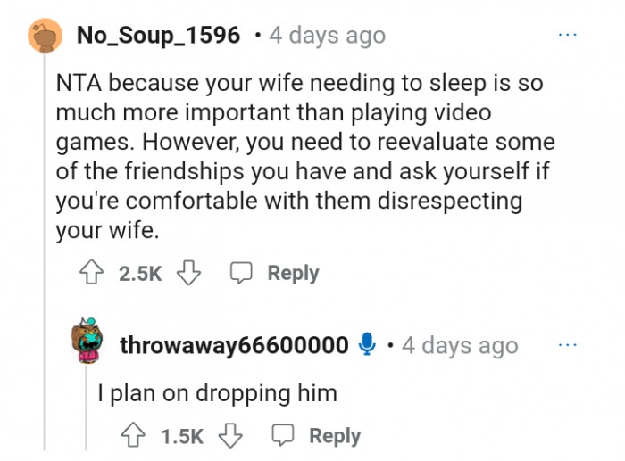 "Your wife needing to sleep is so much more important than playing video games."