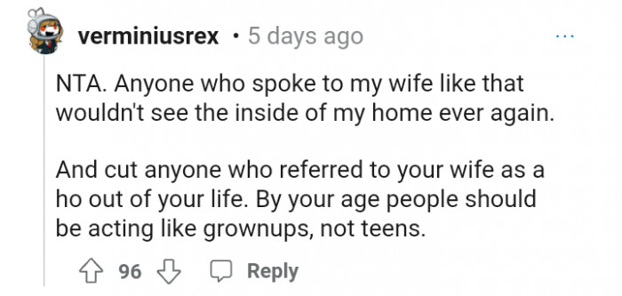 "Anyone who spoke to my wife like that wouldn't see the inside of my home ever again."