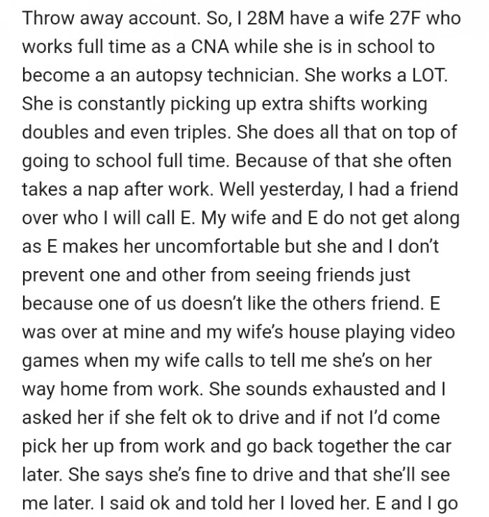 throwaway66600000When the author's wife returned, he politely asked E to leave so that his wife could get some rest. But E took offense to the request.
