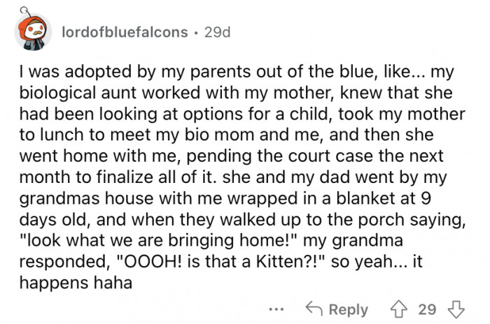 In this case, the Redditor's comment can be interpreted as an attempt to diffuse tension and perhaps express disbelief at the suddenness of the adoption.