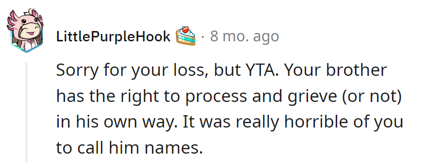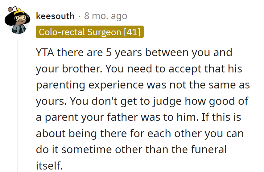 The brother's decision to abstain from the funeral reflects a deeper emotional struggle, likely rooted in unresolved grief and anger toward their father's perceived shortcomings. Psychological research suggests that when individuals feel their emotional experiences are dismissed, they may withdraw from family events as a form of self-protection.