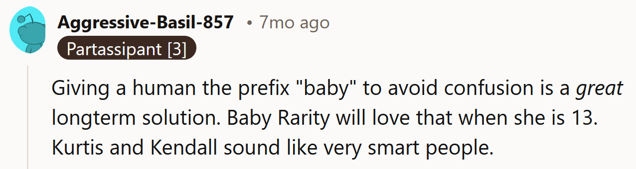 But they said they were giving the baby the same middle name as the OP, and if it wasn't obvious who was being referred to, they could add the word "baby" in front of the name. The OP thinks this is weird, but her parents say it's sweet.