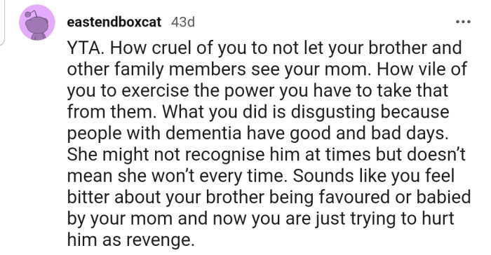 OP shared that his mother lives in a dementia care facility, as she has Alzheimer’s disease. OP’s brother, Todd, who has always been their mother’s favorite, visited the facility, and their mother didn’t recognize him.