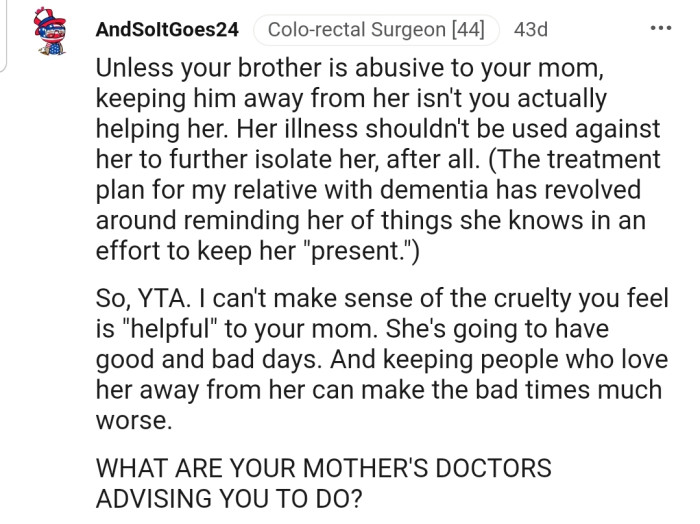 Although OP claims that he only did this for his mother’s health benefit and to preserve her happiness, Todd and his family believe OP is the AH for preventing them from seeing their mom/grandma.