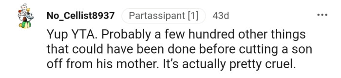"YTA...Probably a few hundred other things that could have been done before cutting a son off from his mother"