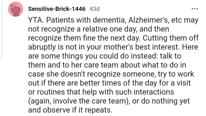 Unfortunately, OP's mom's inability to recognize Todd made her upset that a stranger was in her room. When OP heard about this, he instructed the facility manager (as per his mother’s power of attorney) not to allow anyone besides him and his wife to visit his mother.
