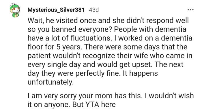 "Wait, he visited once and she didn't respond well so you banned everyone? I am very sorry your mom has this...But YTA here"