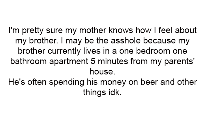 Despite her mother's arguments that it would be financially beneficial, she is hesitant due to her brother's offensive behavior and their troubled history. The brother currently lives in a small apartment and spends much of his money on beer and other things.