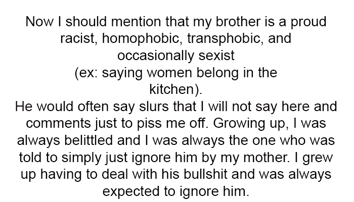 A 23-year-old woman is house hunting and plans to move out on her own. Her mother suggests that her older brother, who is racist, homophobic, transphobic, and sexist, move in with her to help pay the mortgage.