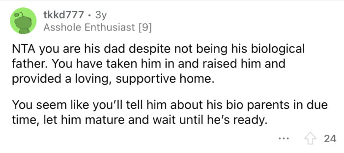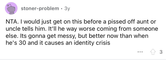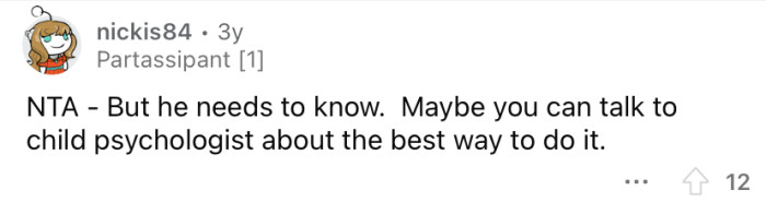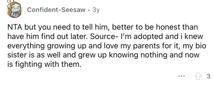 In a later update, the OP said that after an overwhelming response from the Reddit community, he and his wife decided it would be the right thing to tell Josh the truth. Keep scrolling to see what people had to say.