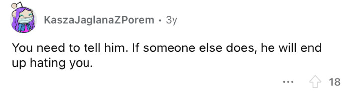 "Better to be honest than have him find out later."