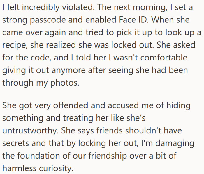Now every time OP looks at the fallout, it’s hard to ignore how the friend didn’t just snoop, she then blamed OP for locking her out.