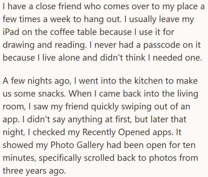 That unlocked iPad was OP’s trust in action, until the friend started scrolling through three years of private photos like nobody had boundaries.