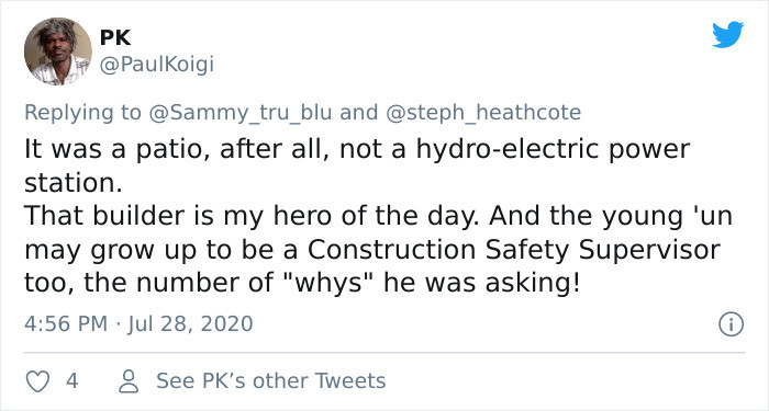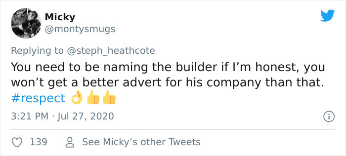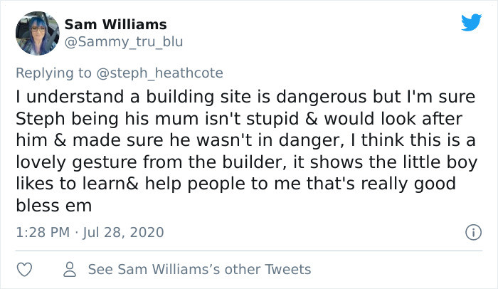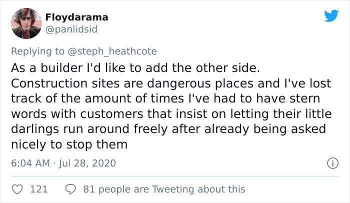 He posted on Twitter: “Construction sites are dangerous places, and I’ve lost track of the number of times I’ve had to have stern words with customers who insist on letting their little darlings run around freely after already being asked nicely to stop them.”