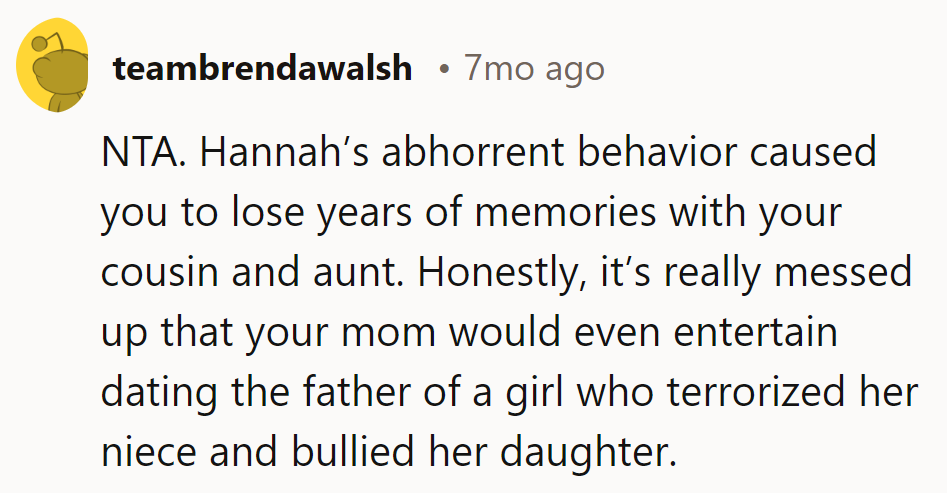 The girl's resentment grew as her mom distanced her from her aunt and cousin, punishing her for not including Hannah. Even as Hannah matured and stopped bullying, the damage was done. Hannah's attempts to connect were met with coldness, as the girl couldn't forget the past mistreatment.