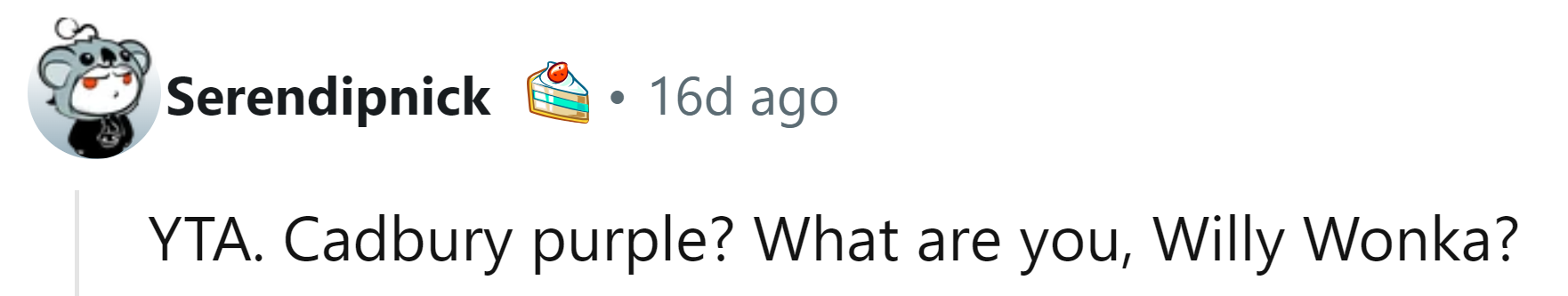But then she started suggesting different colors. The OP reminded his fiancée that he wanted Cadbury purple, but she said it wouldn't go with anything.