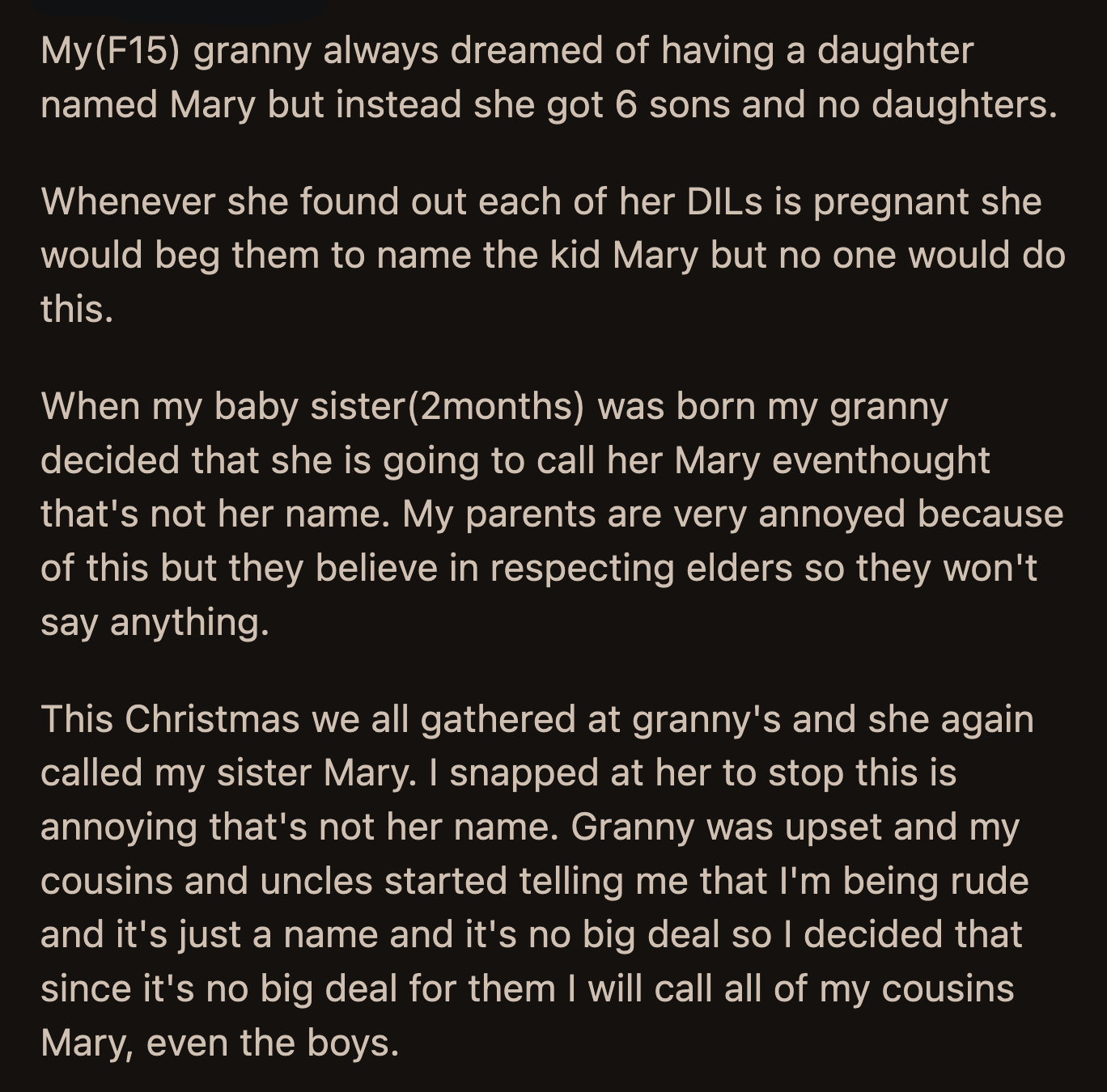 OP didn't buy into that dogma. She snapped at her grandma when she heard her call her baby sister Mary during their family's Christmas gathering at her place.