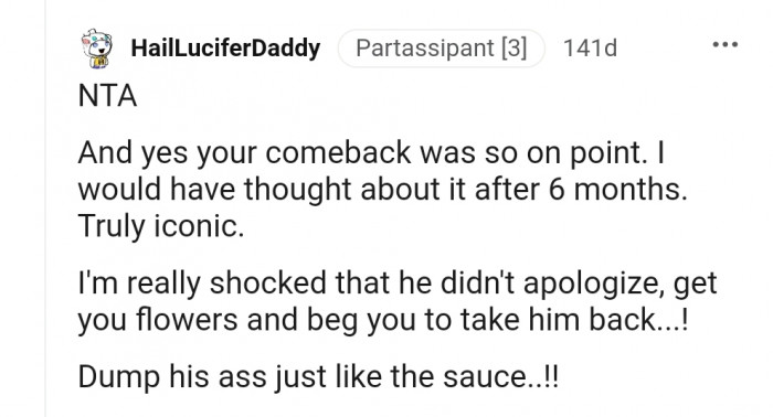 OP wasn't having any of that - In her words, "...that was the shittiest excuse ever"