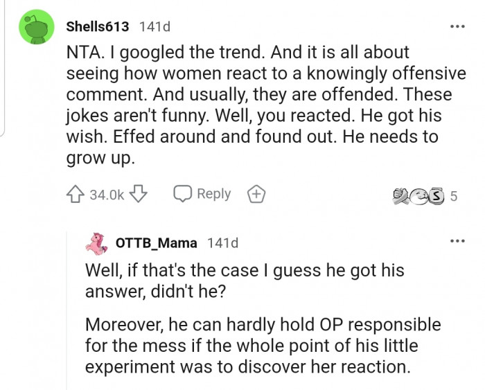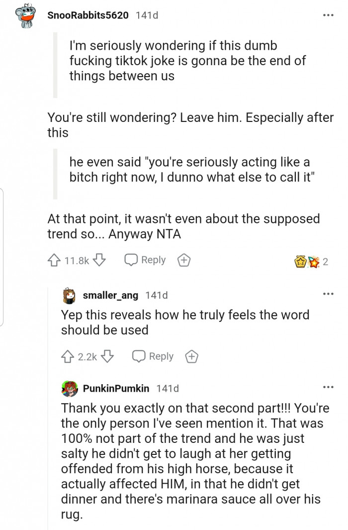 The commenters all agreed with OP and declared her NTA. Many even advised OP to end the relationship with her boyfriend, as what he said was incredibly offensive.