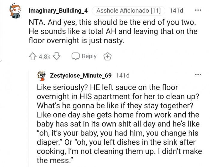 "He sounds like a total AH and leaving that on the floor overnight is just nasty."