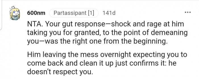 "Him leaving the mess overnight expecting you to come back and clean it up just confirms it: he doesn’t respect you."