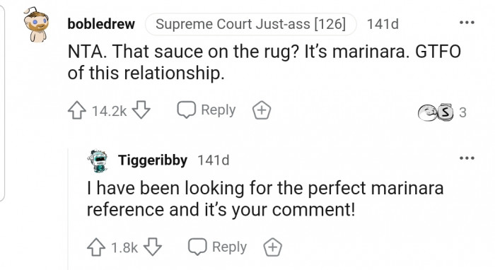 The next morning, her boyfriend sent angry texts to complain about how she had spilled food all over his rug. He also explained that his statement the other night was just a mere joke.