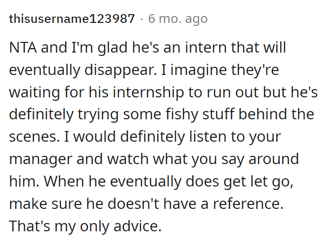 The sentiment among many is that OP is not at fault and that the office is overindulging an intern who seems to be exploiting the situation for personal gain. Several comments suggest the possibility of nepotism or speculate that Brice might be positioning himself for a discrimination lawsuit.