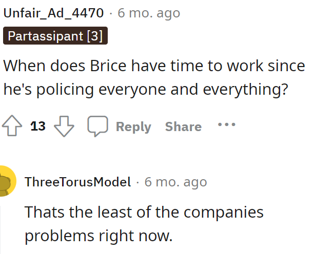 Colleagues who once enjoyed this communal activity begin to ostracize Brice, viewing him as the reason for the loss of their cherished tradition. The situation escalates when OP, while introducing a new coworker, makes a comment about resuming the food-sharing after the departure of the current interns, including Brice.