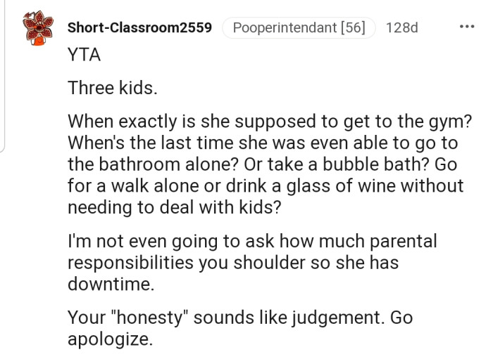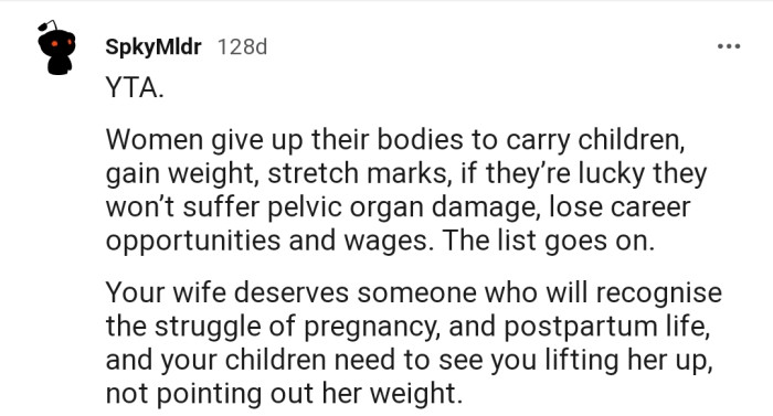 They believe OP should be more understanding, as pregnancy changes a lot about a person’s body. They also shared their personal experiences to drive home their point.