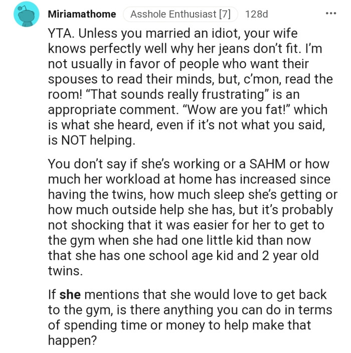 "YTA. Unless you married an idiot, your wife knows perfectly well why her jeans don’t fit."