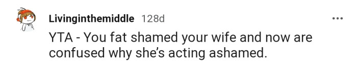 "You fat-shamed your wife and now are confused why she’s acting ashamed."
