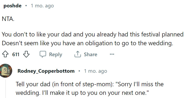 RedditHe has no relationship with his dad. Dad informed OP about his wedding, and it falls on the same weekend as his much-anticipated trip to a music festival