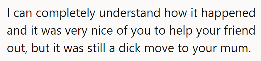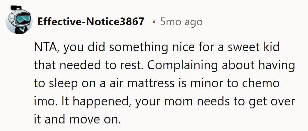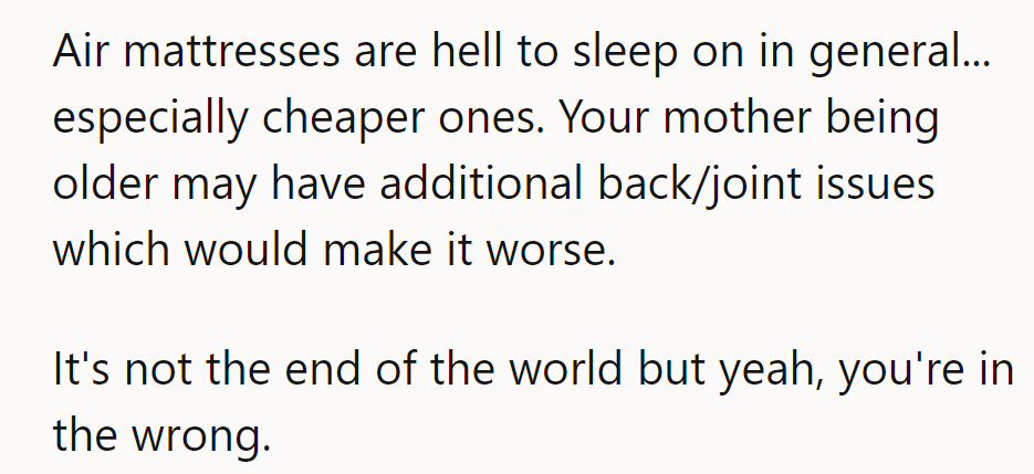 Despite quickly arranging an air mattress and extra blankets for her mom, the situation created tension. This scenario highlights the difficult balance between making spur-of-the-moment decisions to help those in immediate need and maintaining family harmony.
