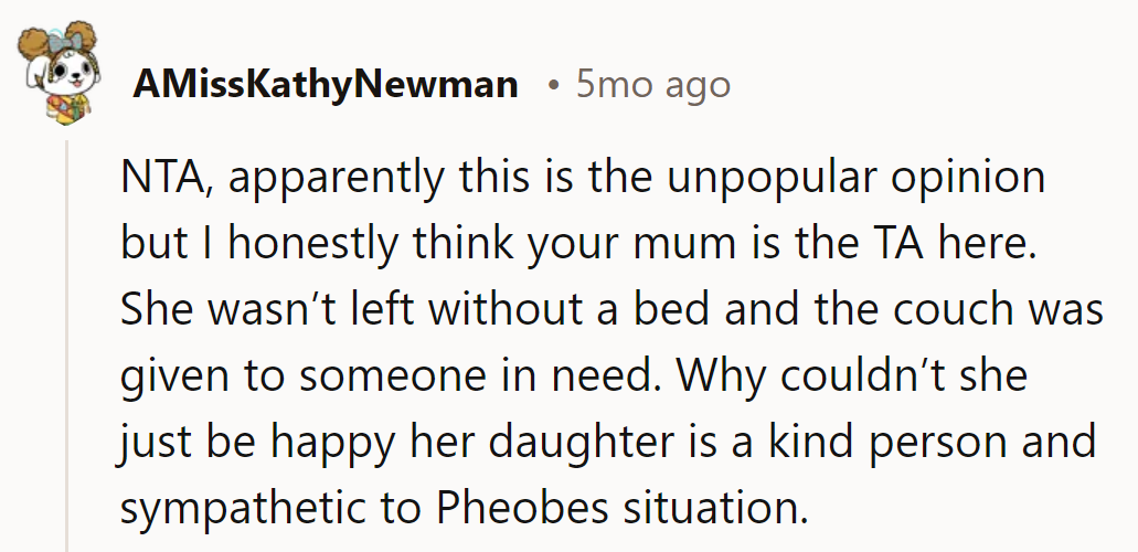YTA light: Friends got the couch, but next time, save the comfy bed for Mom—she might stage a "couch coup"!