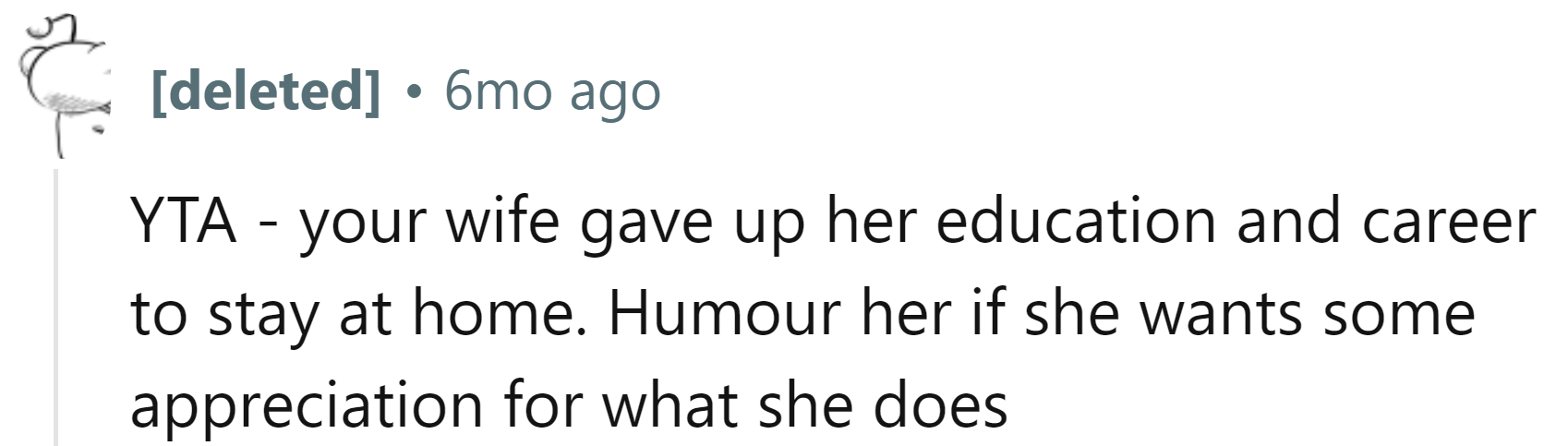 Reddit user u/wifemyjob recently made a rather inconsiderate comment to his wife, who is a stay-at-home mom, and he shared his story in the r/AITA (Am I The A**hole?) subreddit. The OP explained that he works in finance and is fortunate enough to earn enough to support his wife and their seven-year-old daughter.