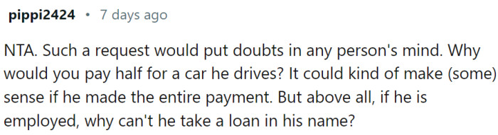 This saga is more than just a debate about a car loan; it's a glaring red flag. When one partner expects the other to jeopardize their financial stability for a dream that's riddled with uncertainties, it screams entitlement and a lack of foresight.