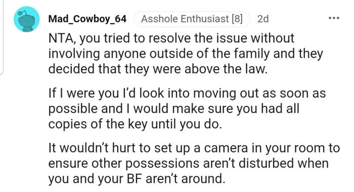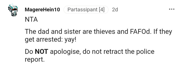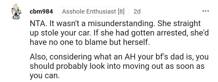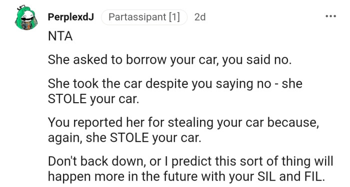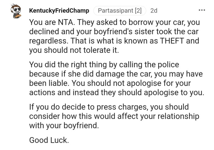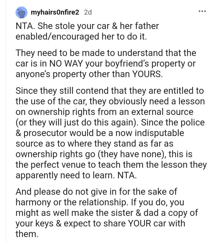 Reddit.comOP's boyfriend's sister took the car regardless, which forced OP to report the car stolen. Now, OP has to deal with the backlash from their boyfriend's dad and his sister. In addition, their boyfriend also feels they went too far by involving the police.