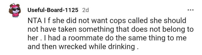"I had a roommate do the same thing to me and then wrecked while drinking."