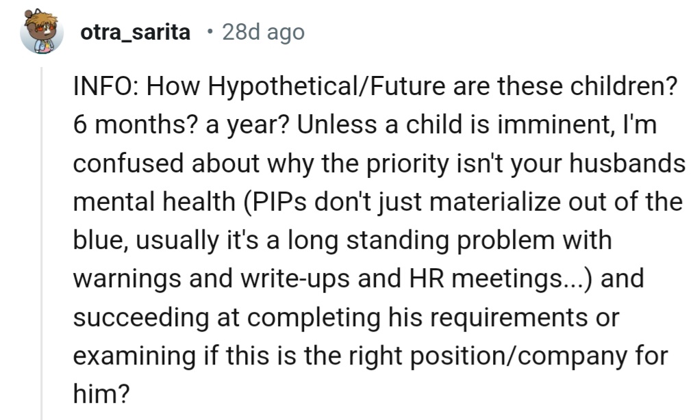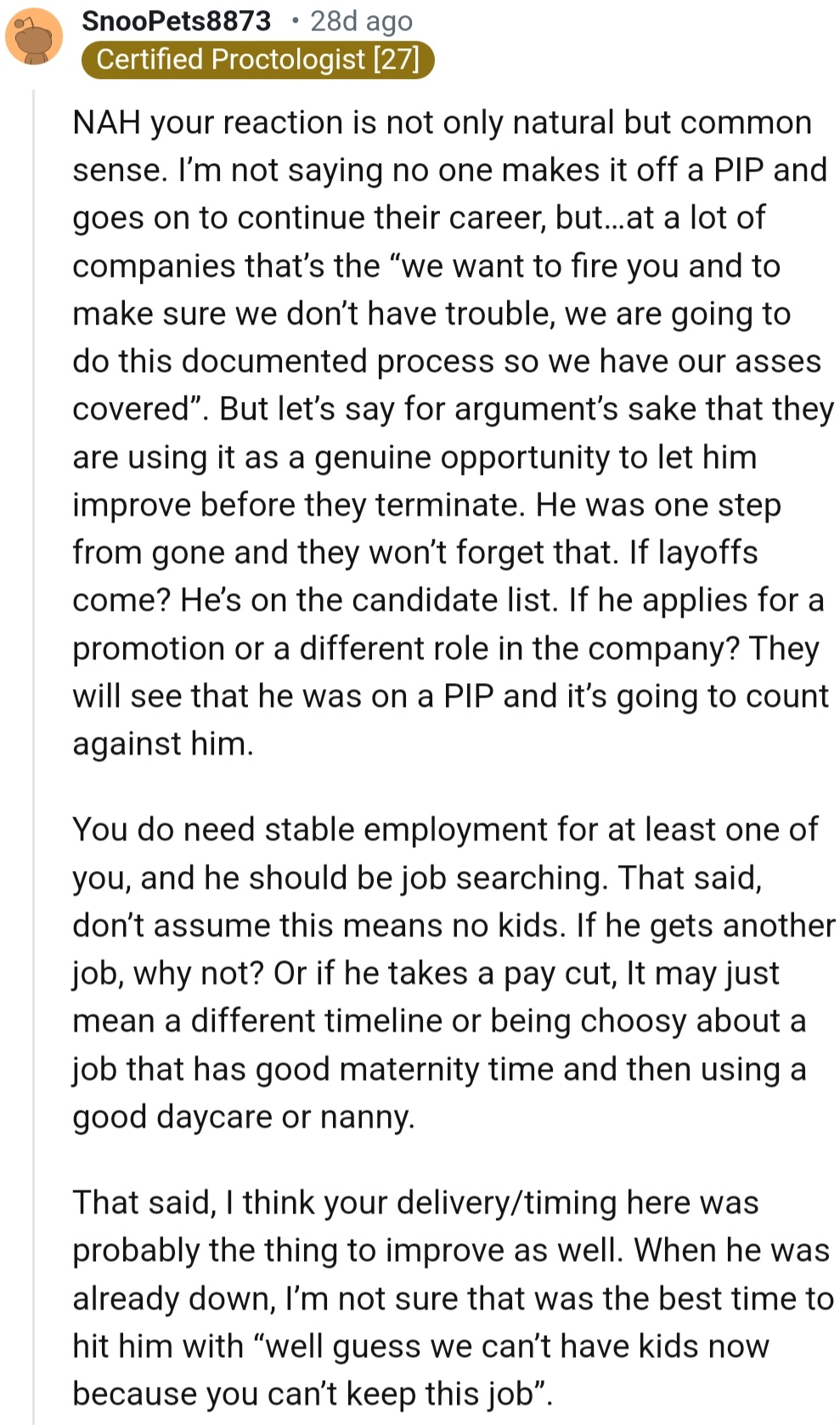 However, OP feels a sudden need for a stable income, which means putting parenthood on hold. This upsets her husband, who perceives that OP has lost confidence in him.