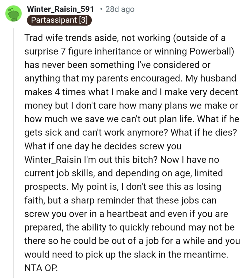 Redditors agreed that OP’s fears weren’t unfounded—relying solely on a single income, no matter how substantial, is risky.