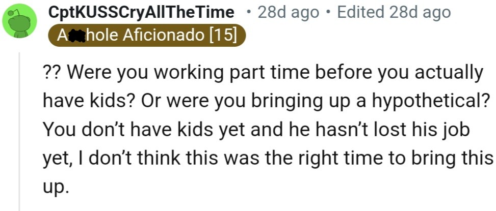 "You don't have kids yet and he hasn't lost his job yet, I don't think this was the right time to bring this up"
