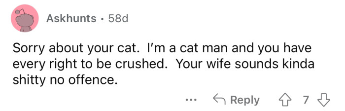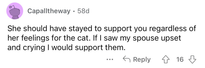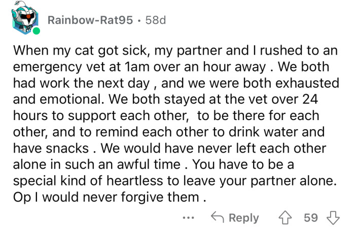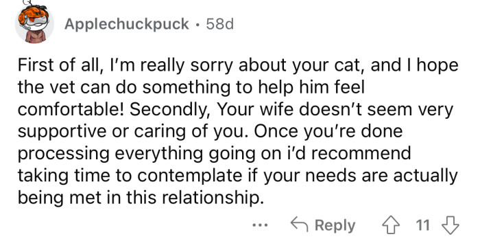 The thought of losing a beloved pet is heartbreaking, and we need all the support we can get from our loved ones when faced with such a difficult loss. However, when one Redditor was facing the loss of her treasured cat, her wife was nowhere to be seen.