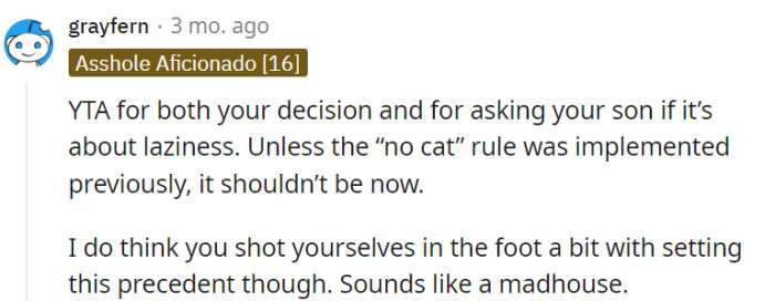 As the parents grapple with their son's disappointment and their own guilt, they seek validation and advice regarding their decision. They question whether their refusal to allow a cat makes them seem unfair or "a-holes," as they put it.
