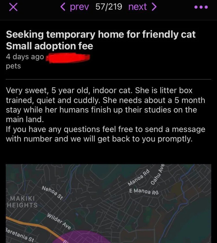 One in particular sought a temporary home for their beloved feline friend, a five-year-old indoor cat described as sweet, quiet, and cuddly. The reason behind the request was seemingly understandable—the cat's owners needed a safe haven while they focused on completing their studies on the mainland.